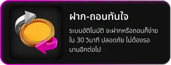 ตอบ : ระบบฝาก-ถอนอัตโนมัติ 24 ชั่วโมง ทำรายการภายใน 30 วินาที รองรับทุกธนาคารและทรูมันนี่วอลเล็ท